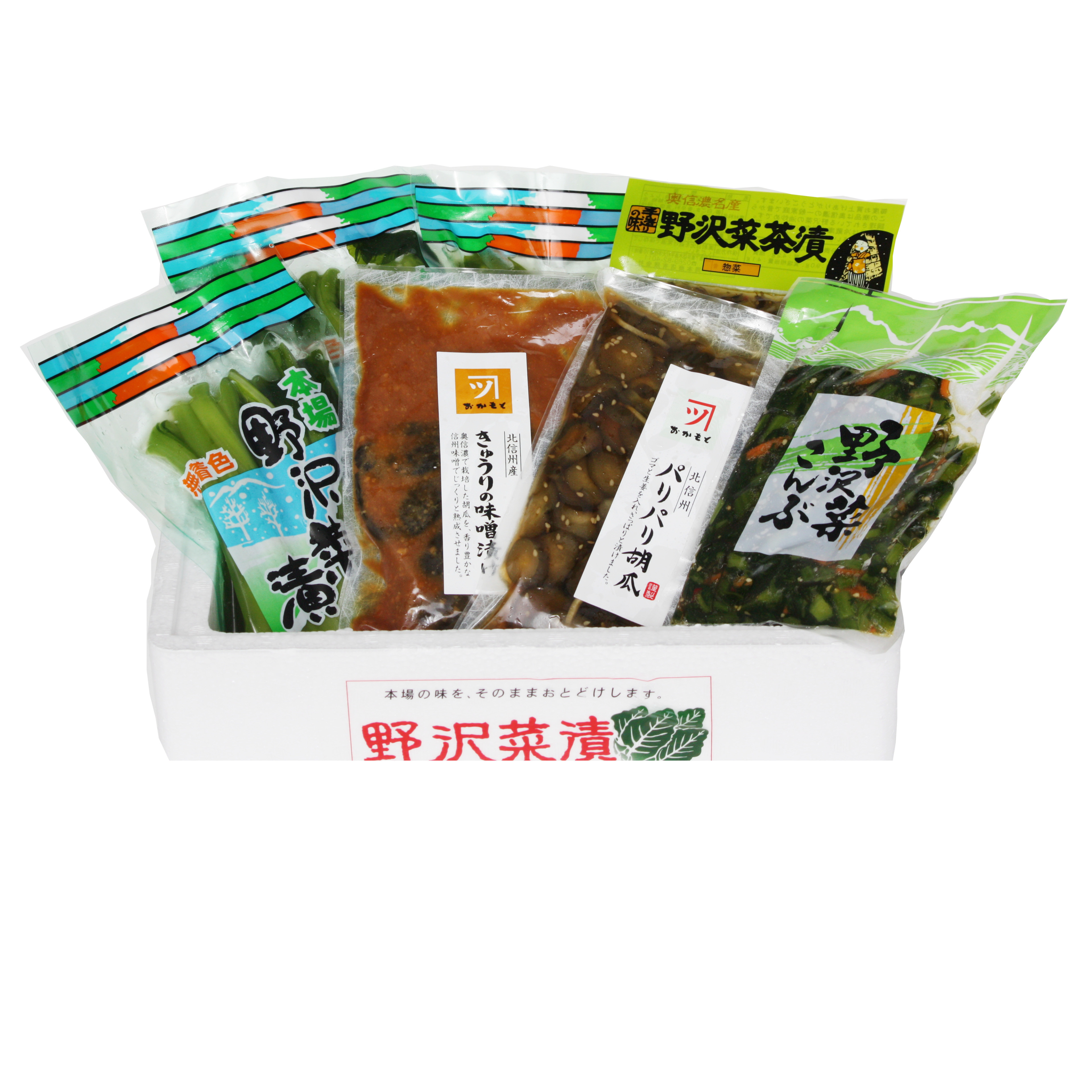 御歳暮セット・・・野沢菜300g3袋、野沢菜茶漬200g1袋、野沢菜コンブ200g1袋、パリパリ胡瓜160g1袋、きゅうりの味噌漬160g1袋
